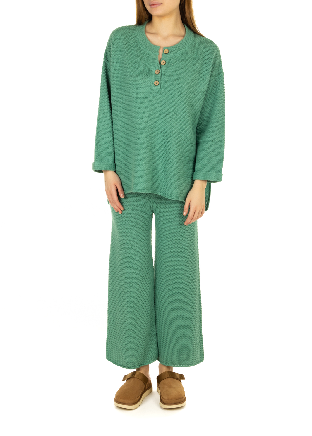 Features: Top: henley neckline, contrasting buttons, dropped raglan sleeves trousers: Elastic waistband, high-waisted design, pull-on style.
