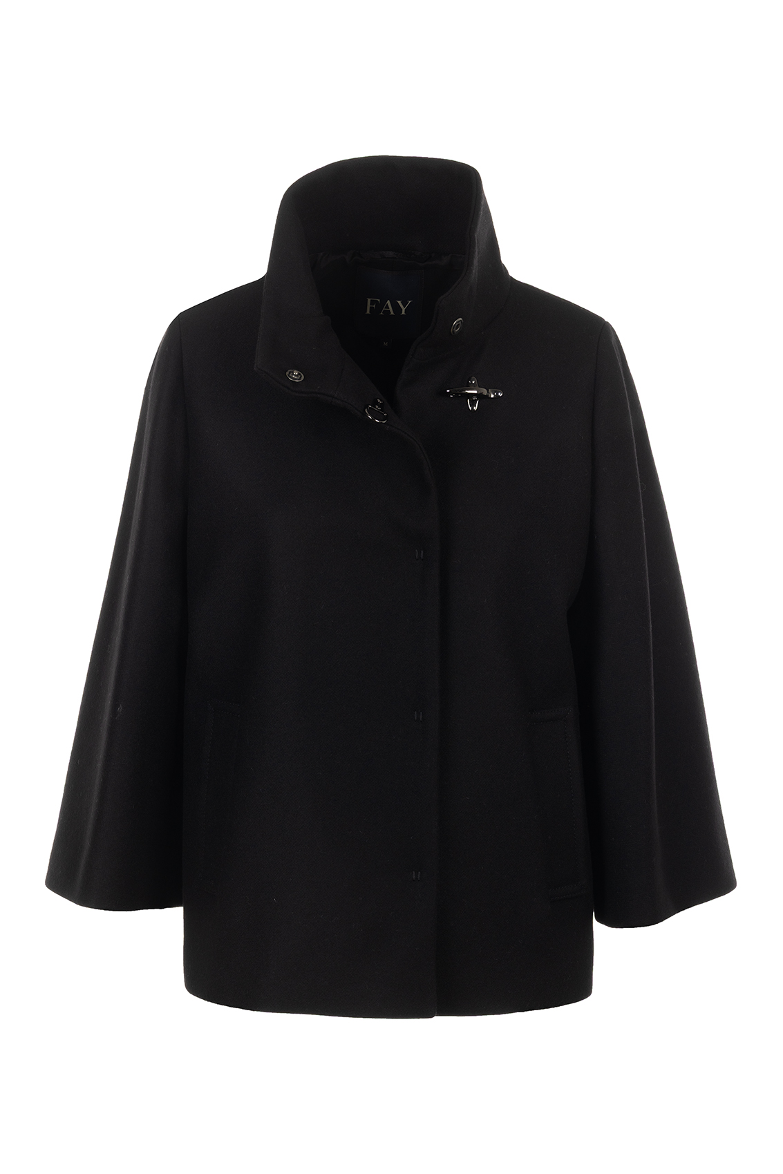 The sleeves are long but wide at the wrists, the garment has a concealed snap fastening and side pockets. It has a high collar.