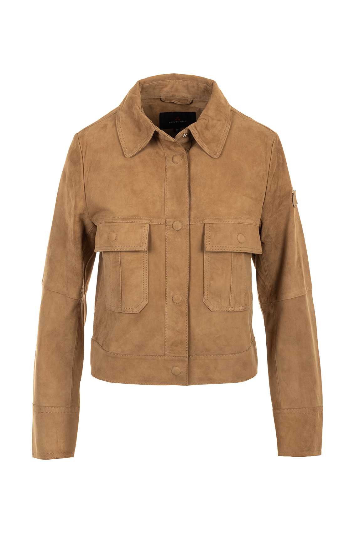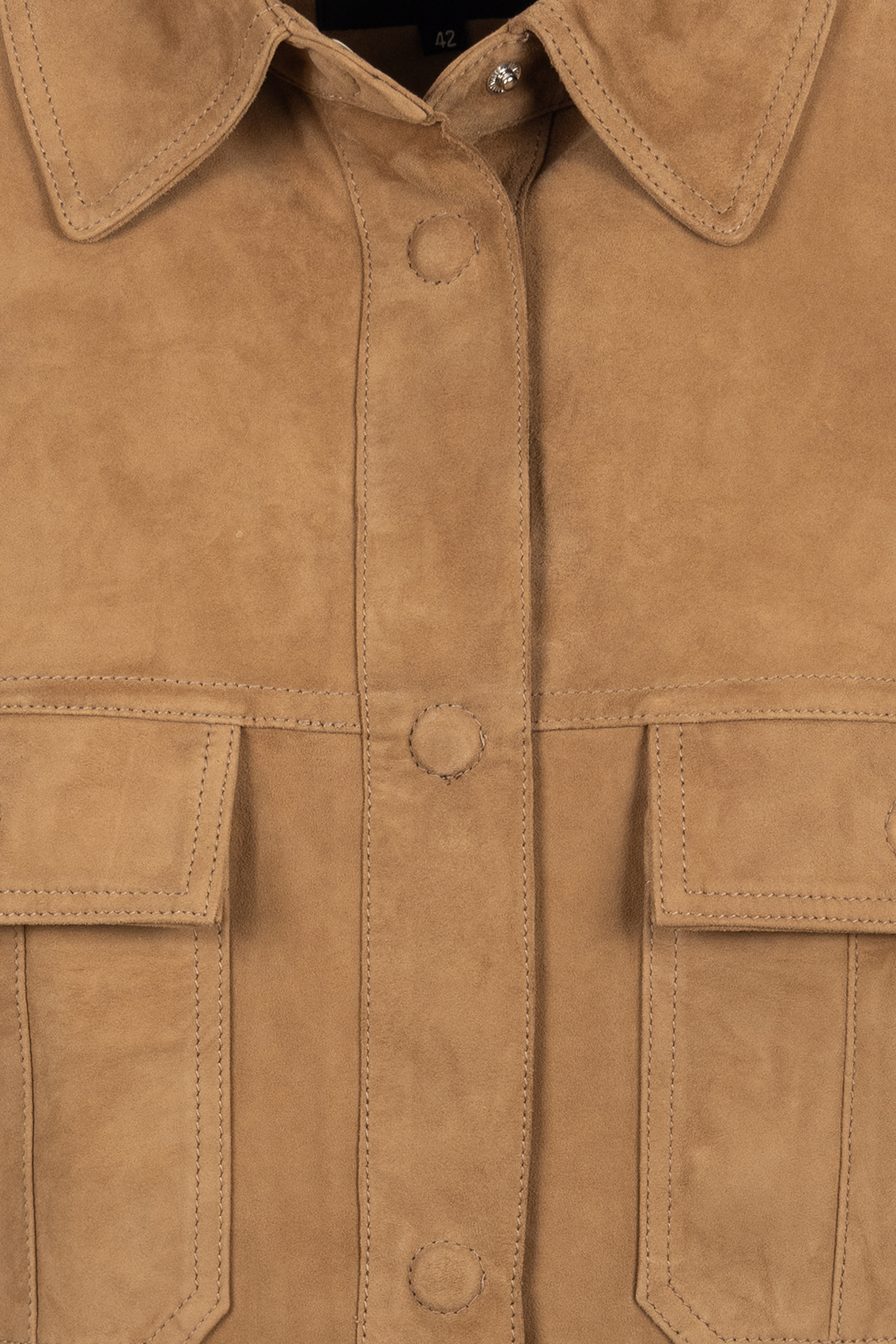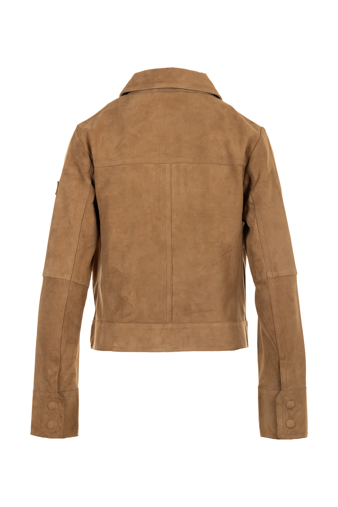 Giacca corta realizzata in pelle scamosciata, con colletto a camicia, chiusura centrale e dettagli funzionali come polsini e tasche sul petto con bottoni a scomparsa