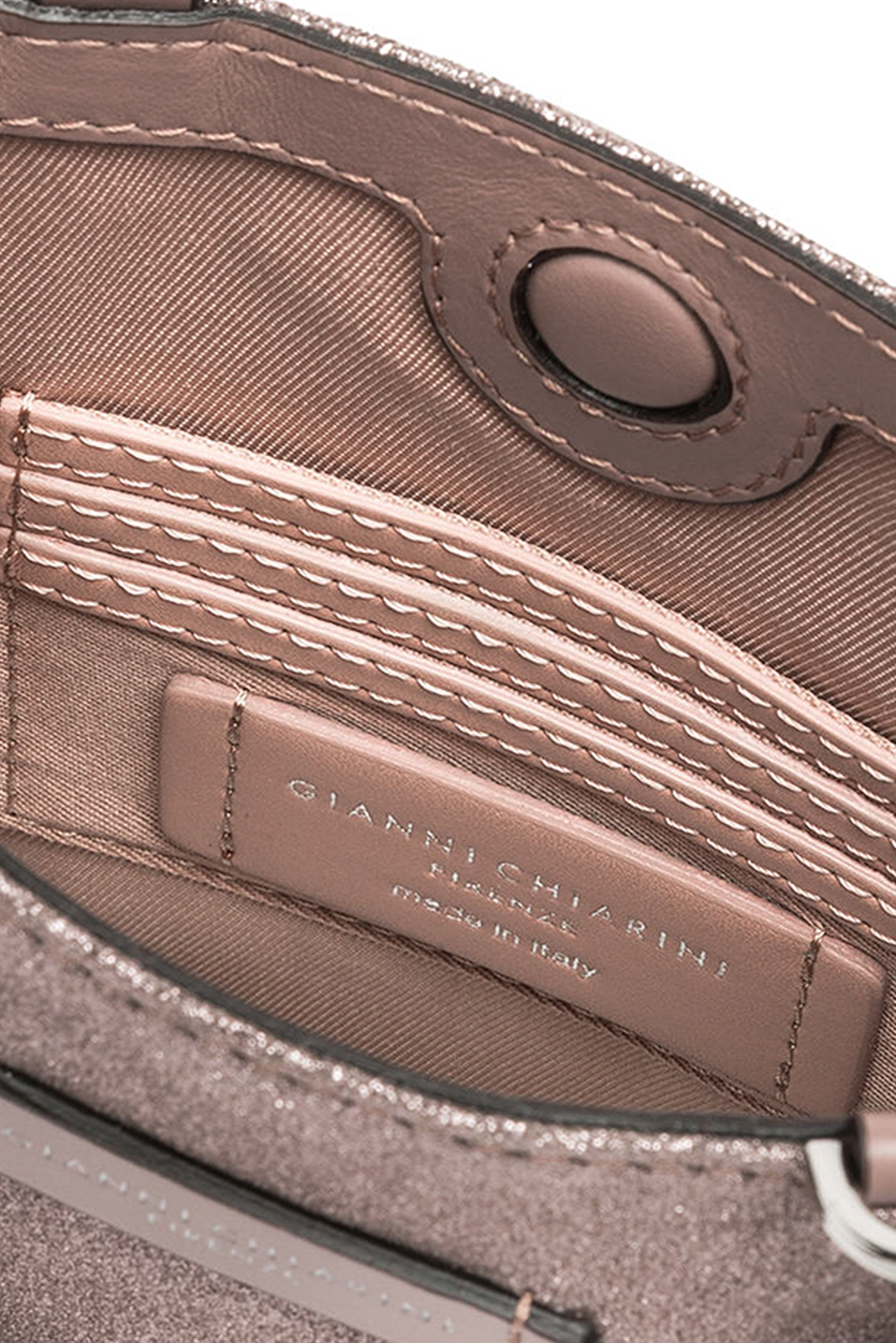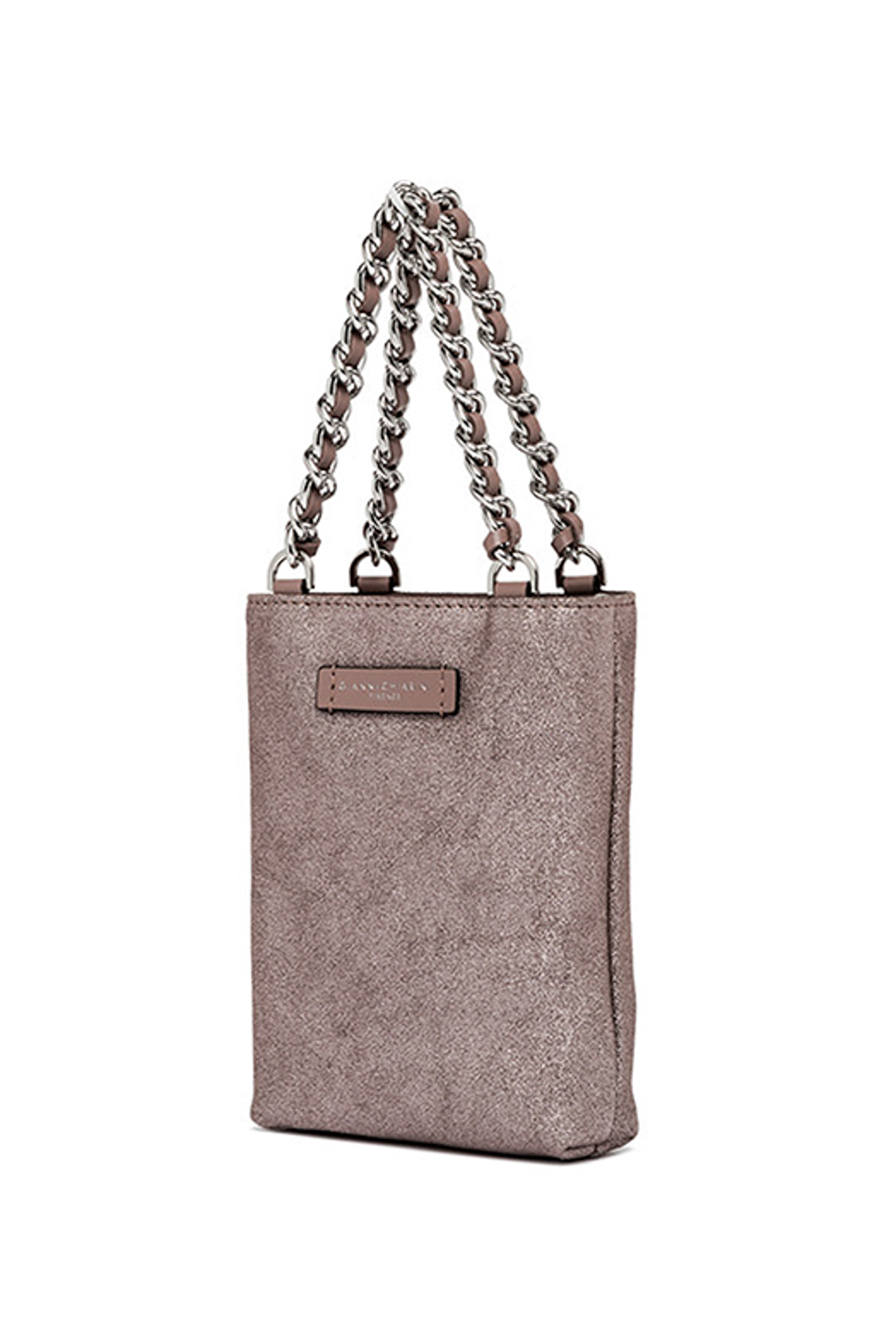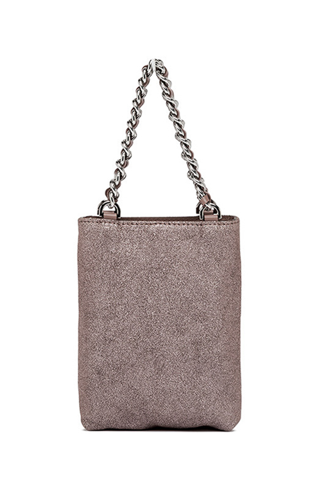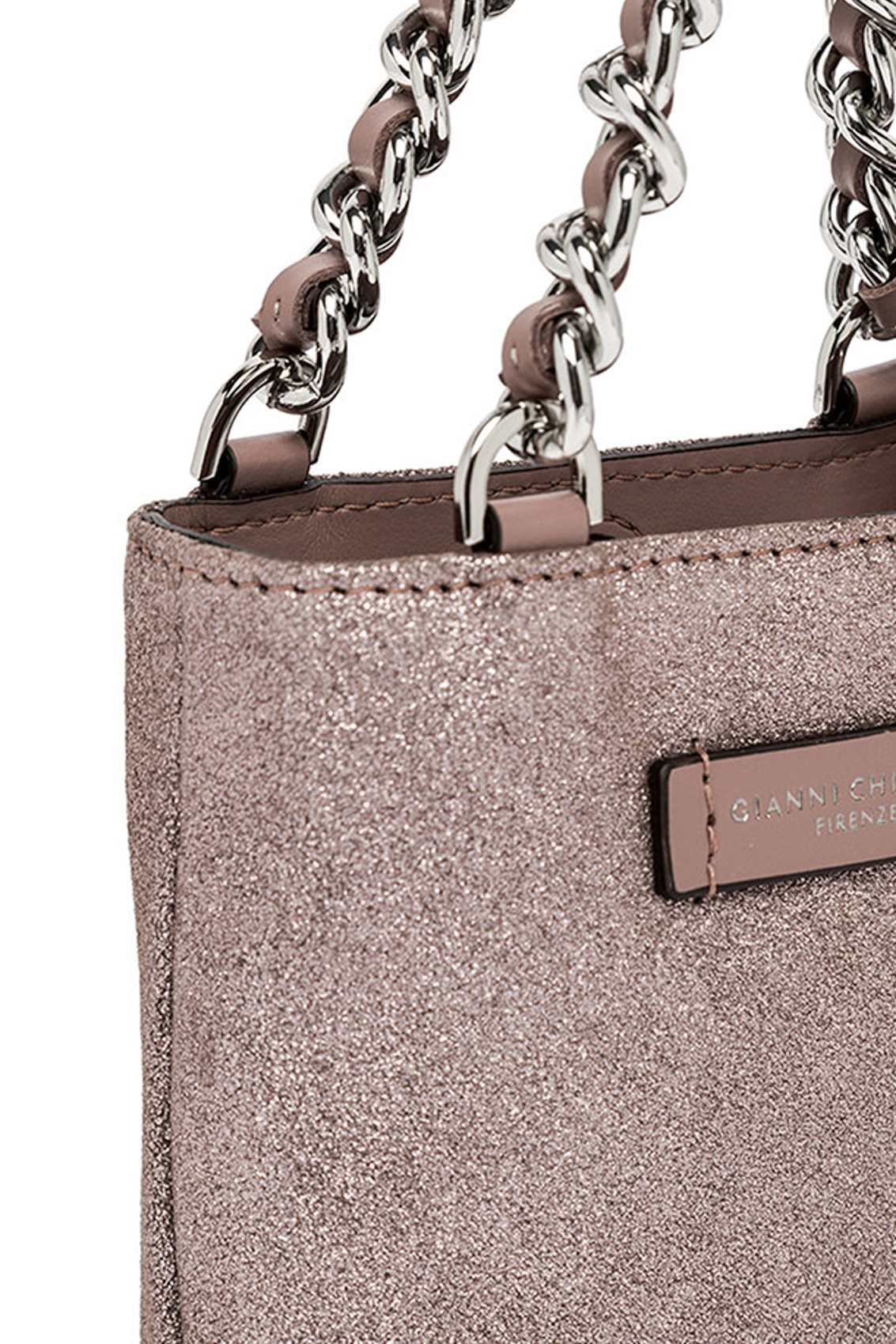 Camilla mini bag in nappa glitter, con doppio manico in catena metallica.