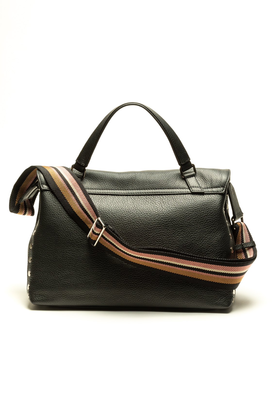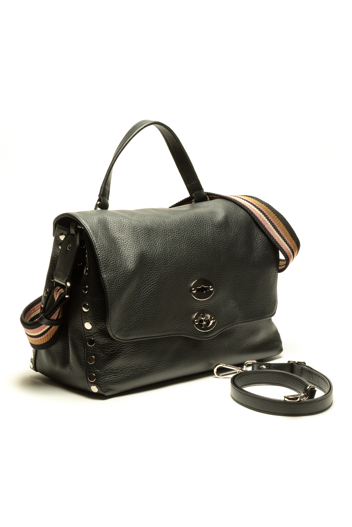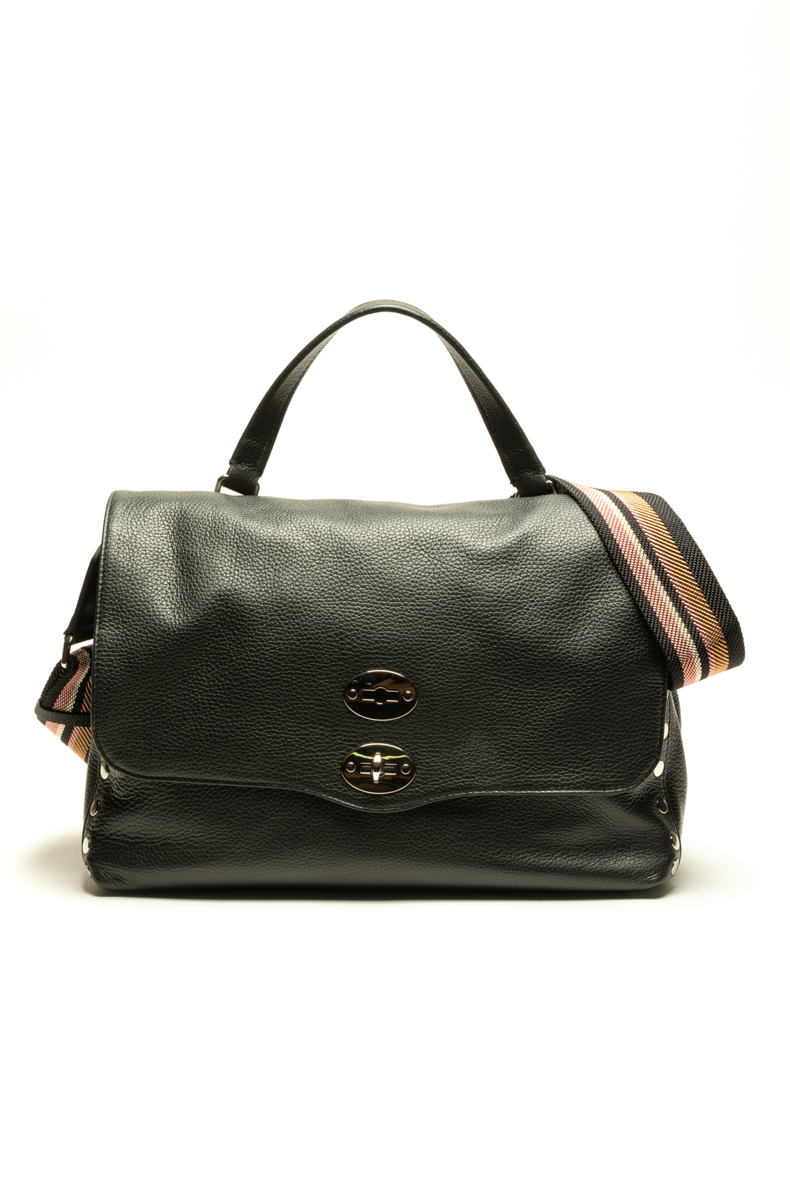 L’iconica borsa Postina, capolavoro dell’artigianato Made in Italy, è aggiornata con una doppia tracolla regolabile: una classica in pelle e una in tessuto jacquard. La doppia chiusura a girello sulla pattina e le borchie laterali conferiscono una nota luminosa all’accessorio. Lo spazio interno foderato è dotato di una pratica tasca, indispensabile per tenere a portata di mano tutto ciò che ti serve.